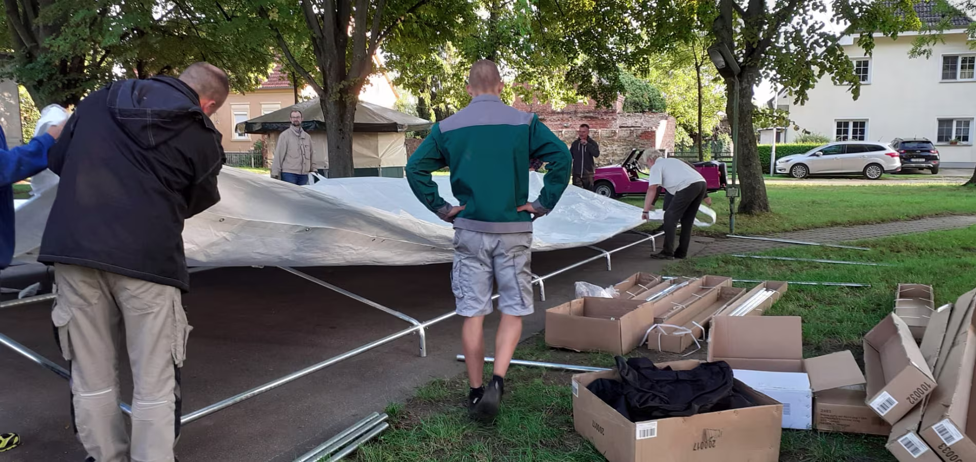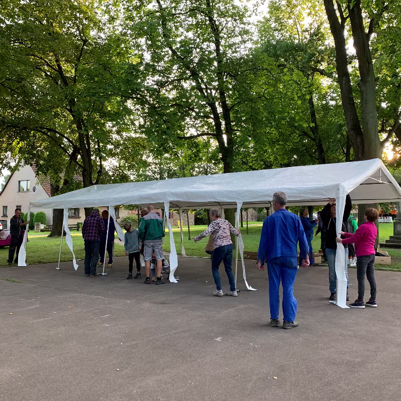 Tag 1 Platte und Bushaltestelle reinigen Tag 2 Zelt aufbauen und Bierzeltgarnituren aufstellen Tag 3 Dekorieren, E-Anlage aufbauen und prüfen, Gelände einzäunen 02.09.2023 19. Oltimer-Treffen11.07.2023 Störche
