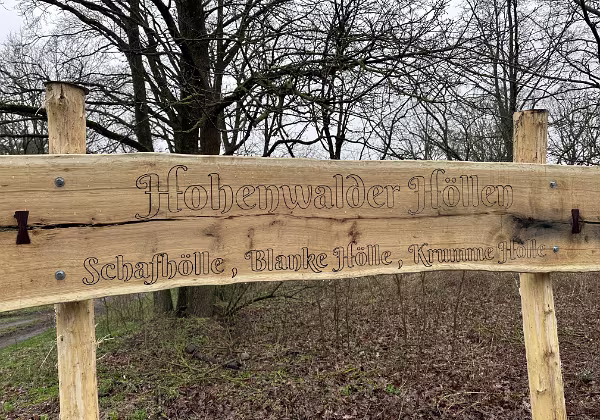 Fleißige Helfer haben ein Schild aufgestellt, das den Weg zu unseren Hohenwalder Höllen weist.