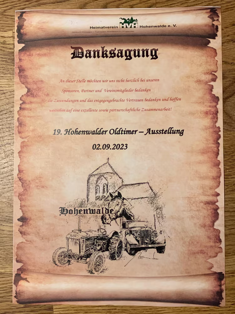 Frühschoppen und Schlagergottesdienst Ehrung der Kameraden der Freiwilligen Feuerwehr Stärkung zum Mittag ... und schon wird wieder alles abgebaut 18.10.2023 Hohenwalde im Nebel02.09.2023 19. Oltimer-Treffen