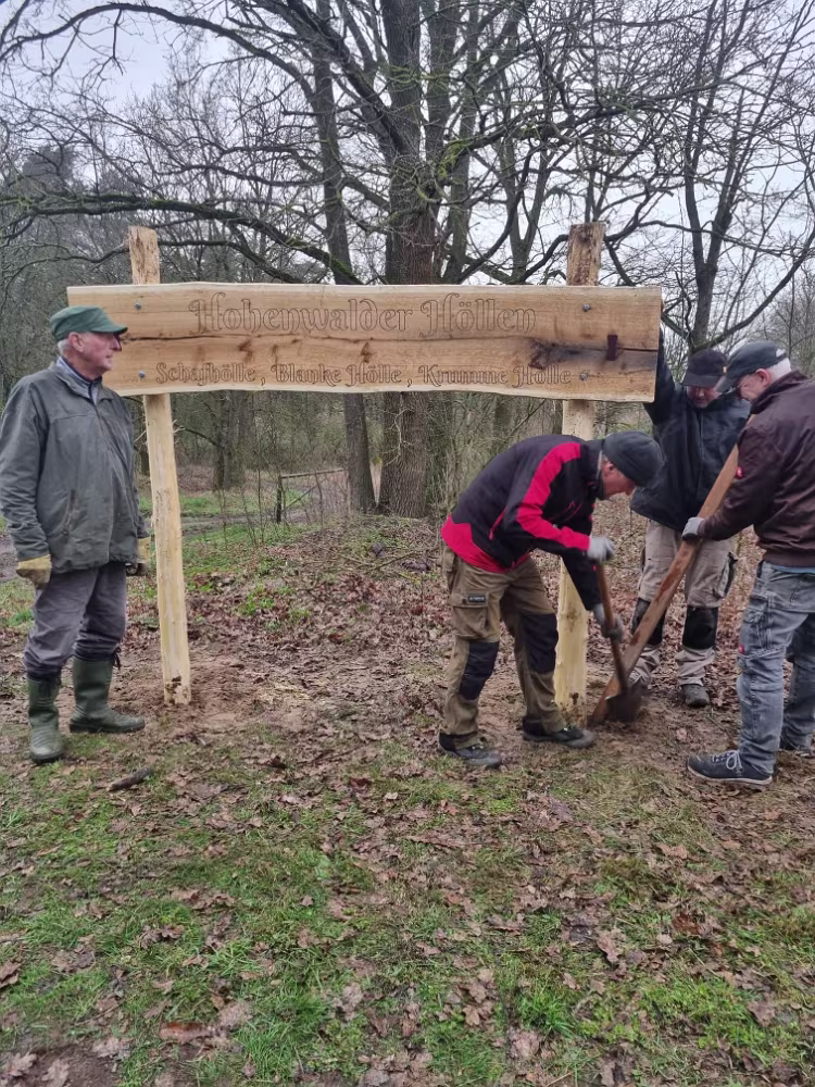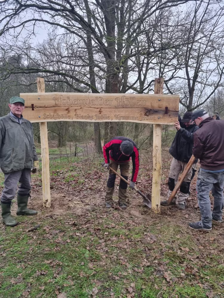 Fleißige Helfer haben ein Schild aufgestellt, das den Weg zu unseren Hohenwalder Höllen weist.